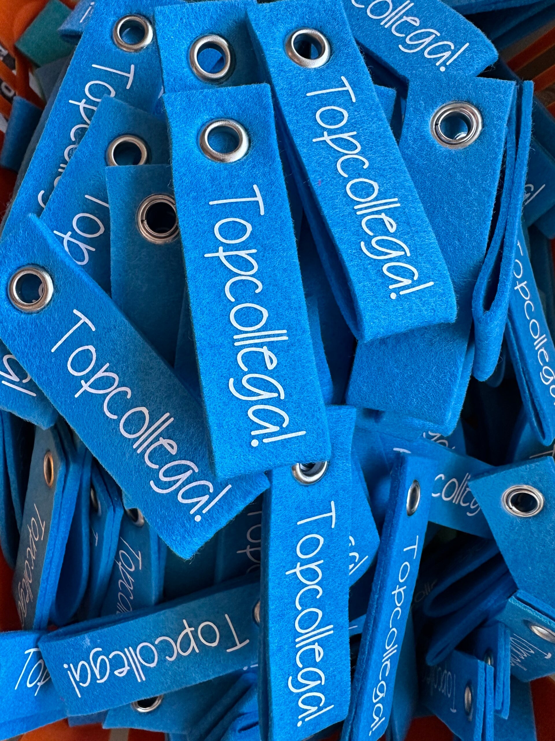 Hoe gaaf zijn deze viltensleutelhangers met 'Topcollega'? Super leuk als traktatie of als bedankje. De sleutelhangers worden inclusief sleutelhanger ring geleverd, zo kunnen ze altijd gemakkelijk ergens aan gehangen worden..