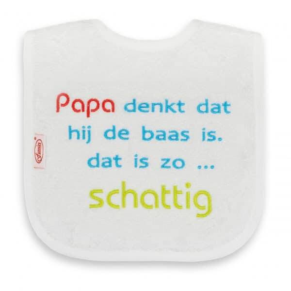 Deze super leuke slab is van het merk funnies. De slab is wit van kleur met daarop de tekst: Papa denkt dat hij de baas is, dat is zo ... schattig! Super leuk natuurlijk om cadeau te doen (aan papa).