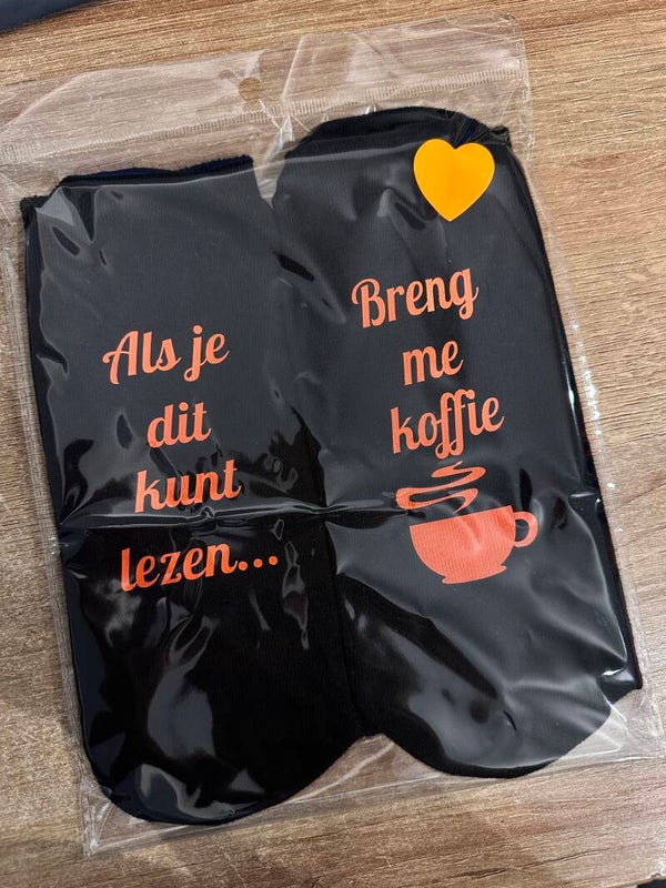 Hoe leuk zijn deze zwarte sokken met tekst: Als je dit kunt lezen... Breng me koffie! Super leuk natuurlijk als cadeautje voor een echte koffieliefhebber!!