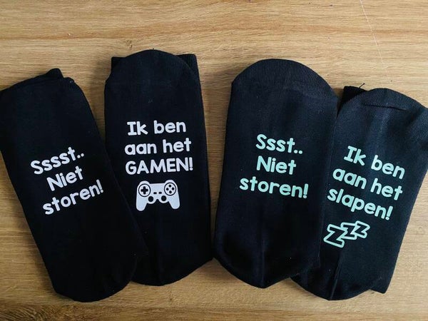 Hoe leuk zijn deze zwarte sokken met tekst: Ssst.. Niet storen! Ik ben aan het slapen!! Super leuk natuurlijk als cadeautje voor iemand die graag zijn of haar ogen even dicht doet!!