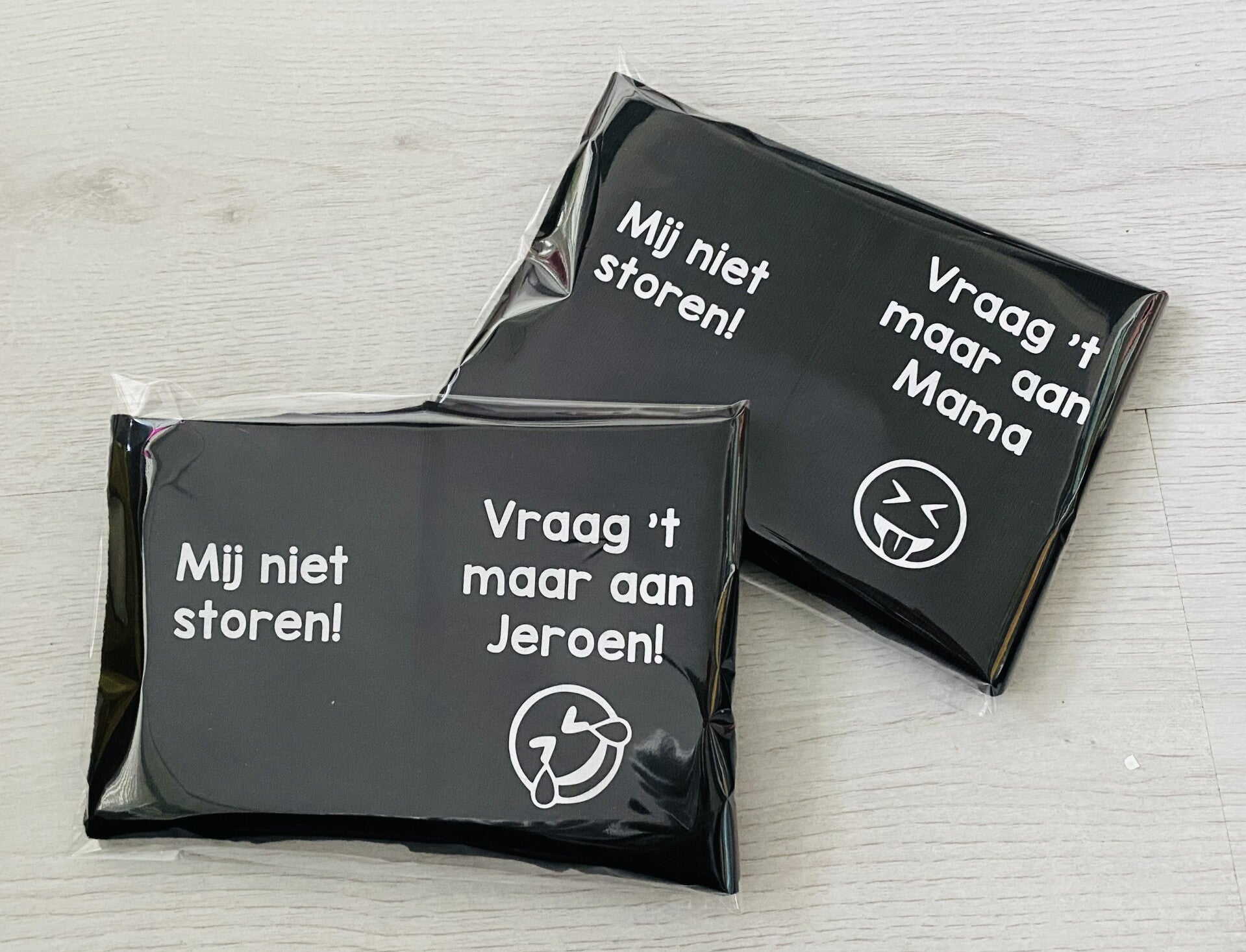 Hoe leuk zijn deze zwarte sokken met tekst: Mij niet storen! Vraag 't maar aan ...! Deze sokken zijn te personaliseren met eigen naam of titel!